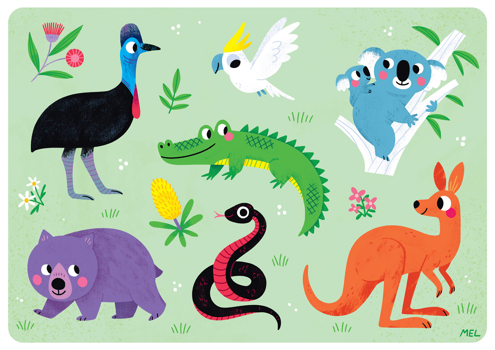 Australian wildlife is weird and wonderful. Here you'll find the cassowary, the cockatoo, the koala, the crocodile, the wombat, the red-bellied black snake, and the red kangaroo!