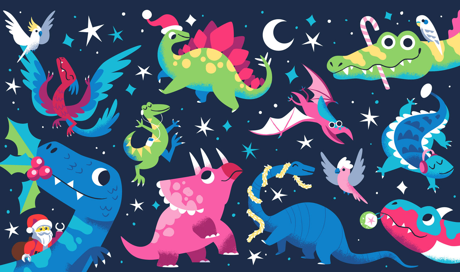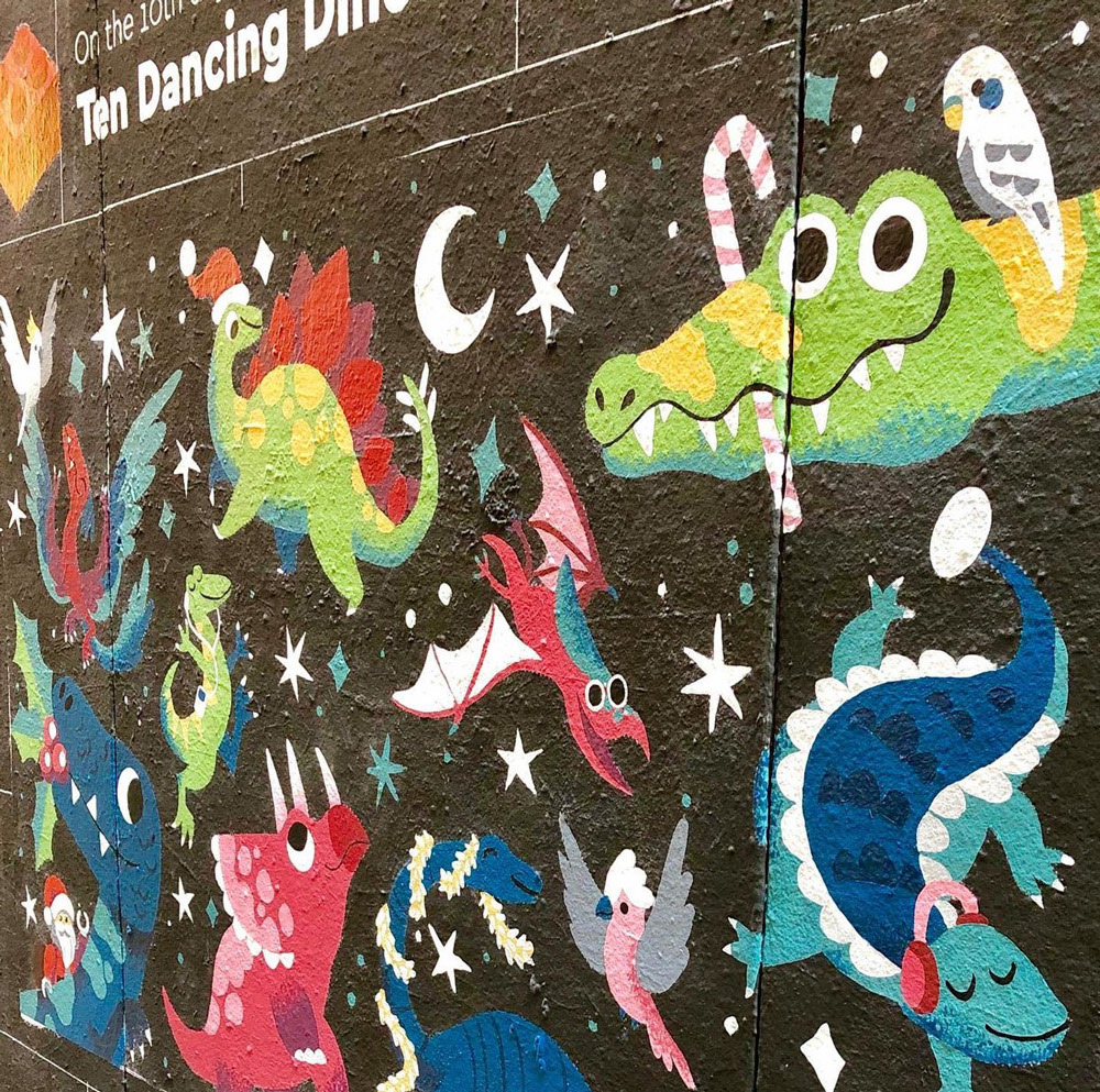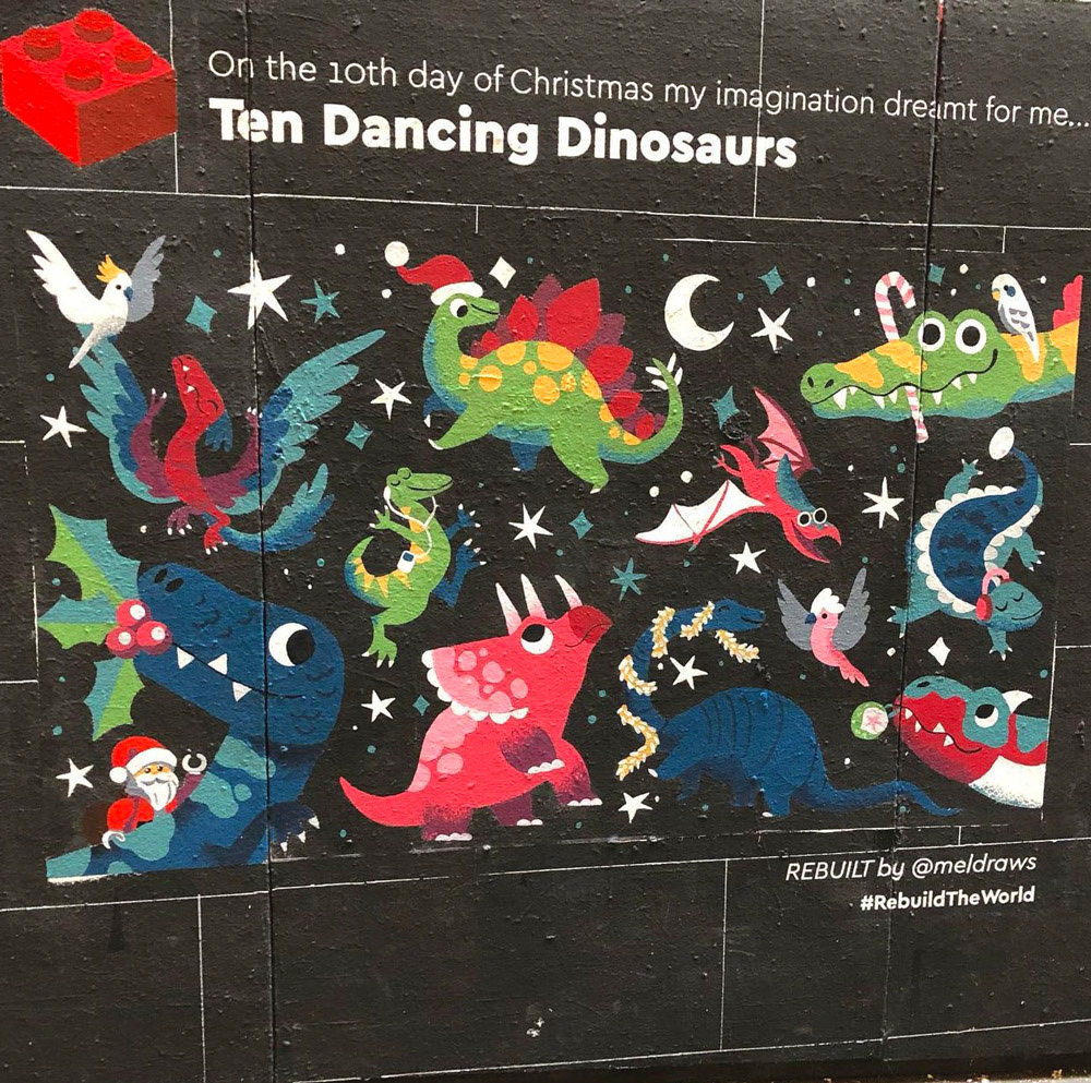 I designed this mural as a part of an exhibition held at Melbourne Central celebrating the 12 days of Christmas, rebuilt by Lego! I was asked to re-imagine the 10th day of Christmas with 10 dancing dinosaurs.